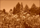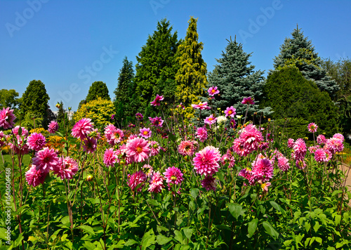 >Plakat>Tematy>Kwiaty>kwitnące dalie, różowe kwiaty dalii na tle iglaków i niebeiskiego nieba, kwitnące dalie w ogrodzie, blooming dahlias, pink dahlia flowers against the background of conifers and blue sky, Dahlia,
