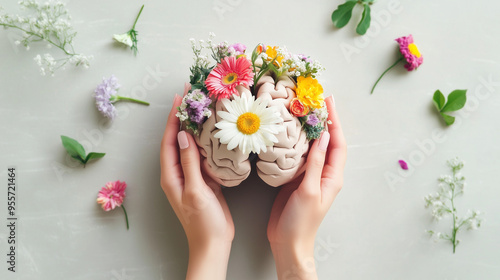 Fototapeta - Ręce trzymające papierową głowę z mózgiem ozdobionym kwiatami. Obraz ten symbolizuje znaczenie zdrowia psychicznego i pozytywnego myślenia.