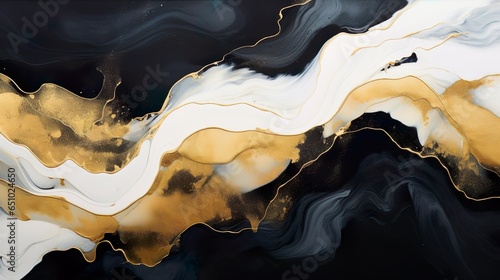 Beautiful abstraction of liquid wall paints black, golden & white background.