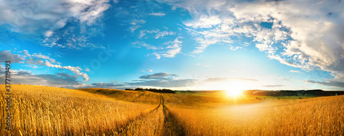 >Plakat>Tematy>Do kuchni>Beautiful natural landscape panorama of golden wheat field at sunset against background of evening blue sky with clouds. Bright colorful pastoral image.