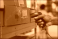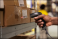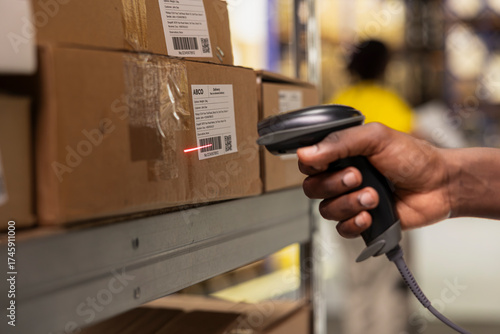 >Plakat>Przeznaczenie>Close up of black worker scanning the barcode awb tags on cargo boxes, registering the merchandise and shipment details before distribution. Using scanner on tracking numbers in depot.