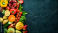 Fresh fruits, vegetables and berries. On a black background. Banner Top view. Free space for your text.