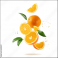 Fresh orange fruit whole and slices with leaves and drops falling flying