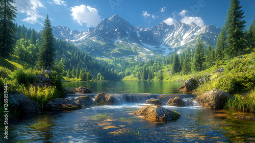 Fototapeta - Krajobraz ośnieżone góry otoczone lasem i czystą płynącą rzeką