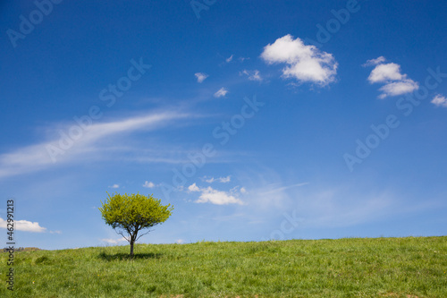 Fototapeta - Samotne drzewo na tle błękitnego nieba.