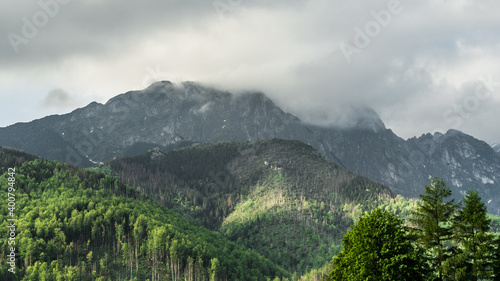 Fototapeta - Zachmurzone skalne szczyty górskie