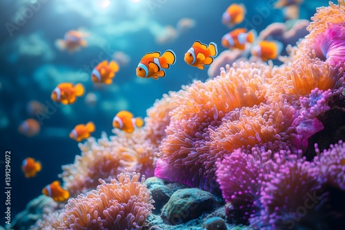 Vibrant coral reef bustling with clownfish and sea anemones in the warm waters of a tropical ocean