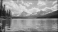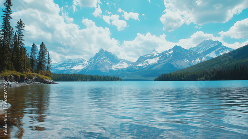 Fototapeta - Panorama jeziora z widokiem na otaczające je imponujące góry, tworzące malowniczy i spokojny krajobraz.