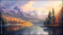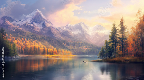 Fototapeta - Panorama jeziora z widokiem na otaczające je imponujące góry, tworzące malowniczy i spokojny krajobraz.